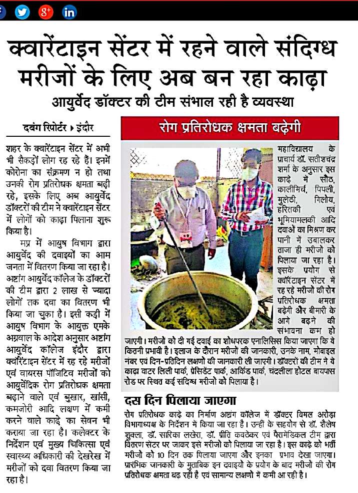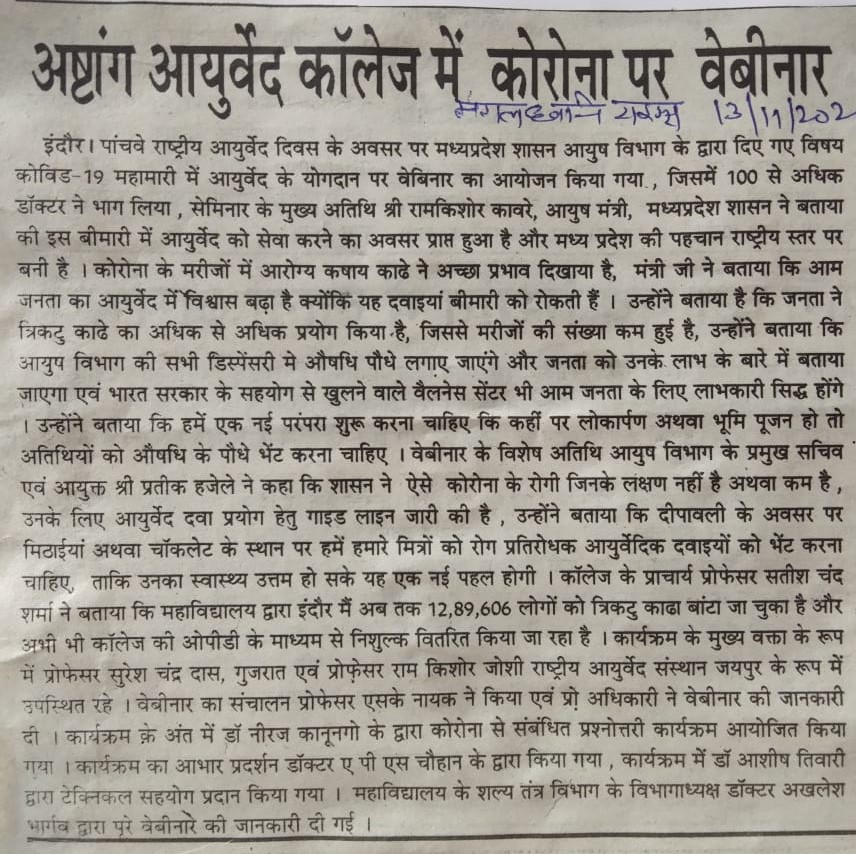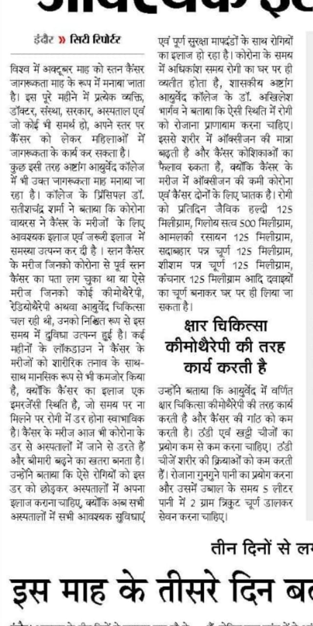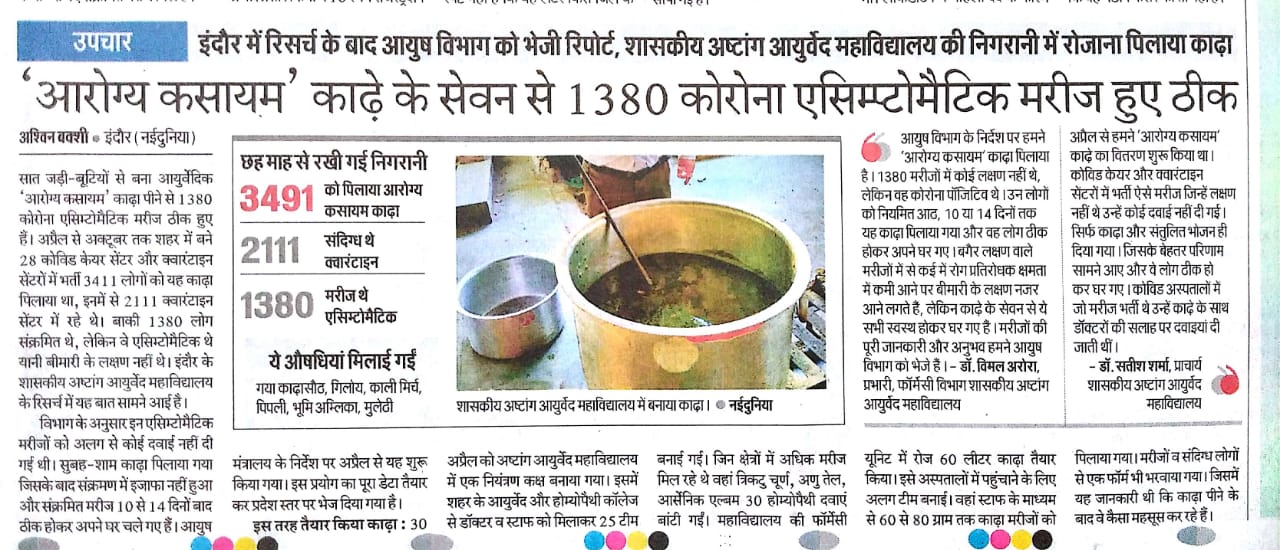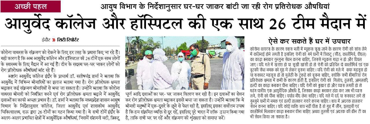 According to Hindu philosophy out of 84 lack yonis in this universe. Human (manav) is considered as the best among all for maintenance of healthy human life lord Brahma have gifted Ayurved before creating the Universe. In 1921 Brahmacharya Ashram Trust was established by Para Pujya swami Dwaraka Duttaji Maharaj in Indore : The Nagri of Maa Ahilya, Initially ayurveda course was run by this trust. In the year 1964 this course got affiliated to Devi Ahilya Vishwavidyalaya Indore (M.P.) India and the degree course was started by the university. By the sincere effort of the staff and leaders of the state, the Madhya Pradesh Governmenttaken over this institution in the year 1972 and the institution named as Govt. Ashtang Ayurved College, Indore. In the year 1998, for better development it got the status of Autonomous from state govt., and named as Govt. Auto. Ashtang Ayurved College. It is situated at Lokmanya Nagar. which is just 5 Km away from the Main Bus Stand and Indore railway station, The college have a good infrastructure in its own 41⁄2 acres of premises. The college is proud to have a newly constructed state of the art Administrative building, Hospital (OPD) building, academic and departmental building, Pharmacy, Hostel, Library, herbal garden, sports, ground etc. This institution has completed its glorious 97 years in service of Ayurveda and the scholars passed out from this institution are rendering their Services to the public of different parts of the state and the country as well.